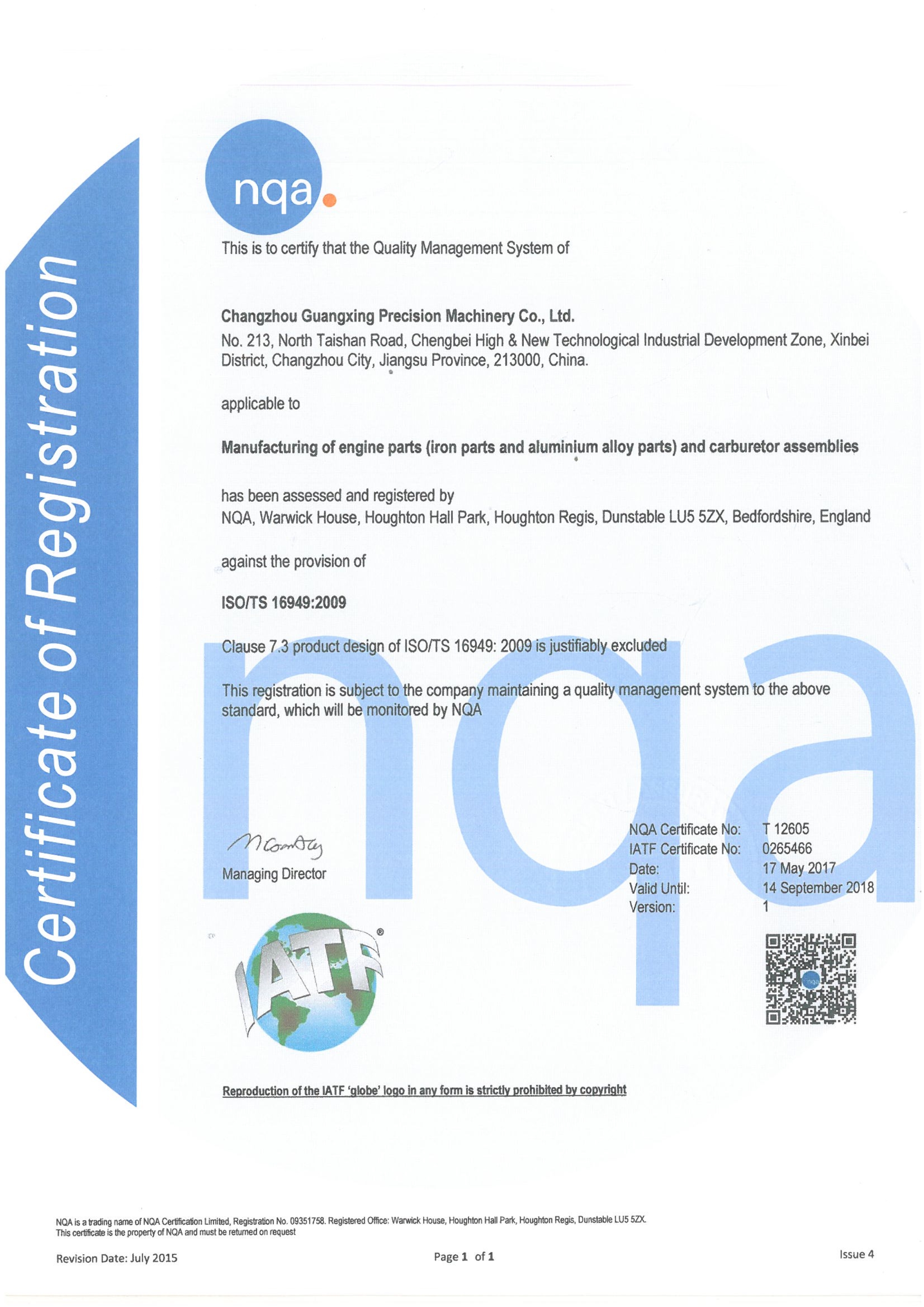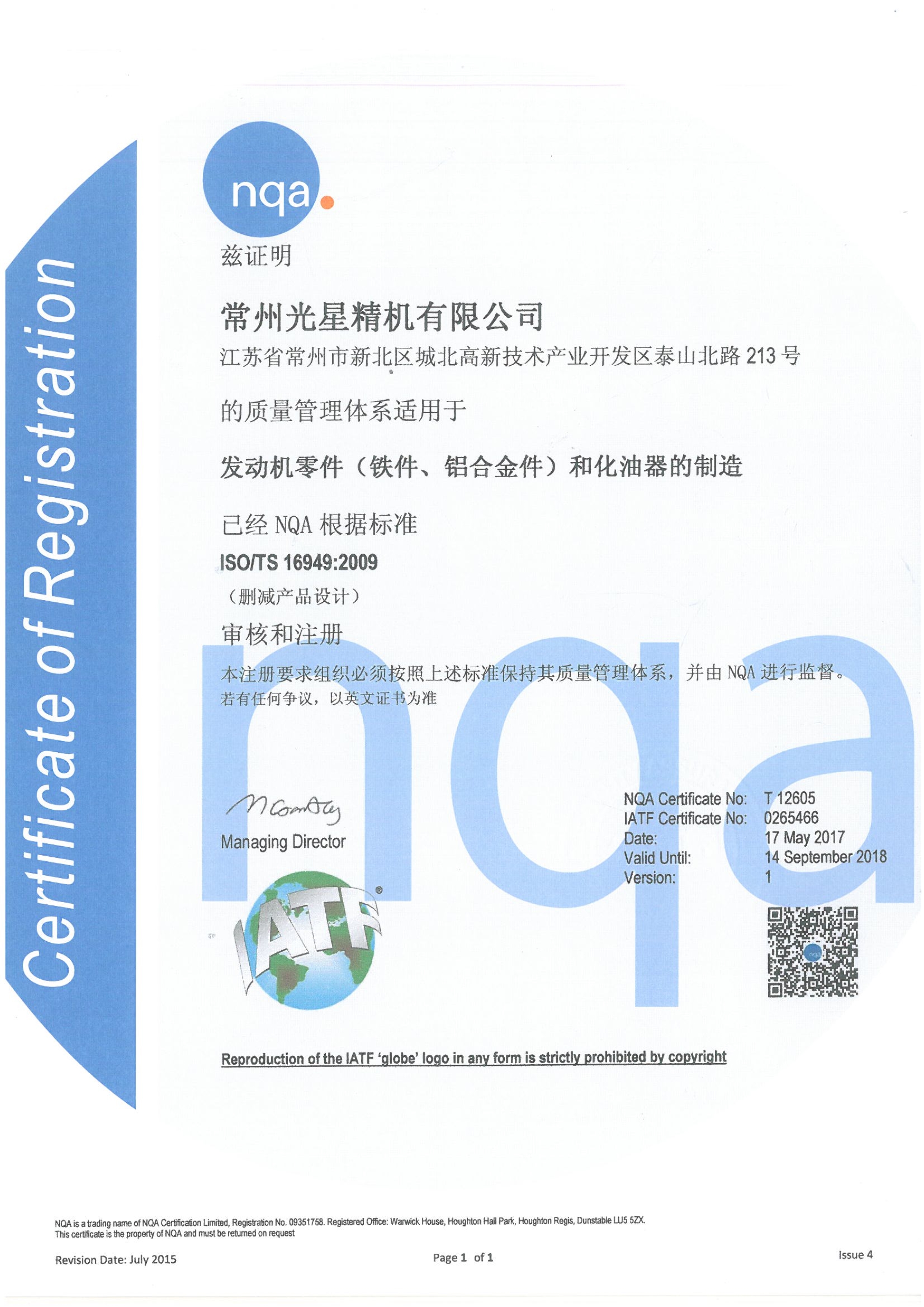 2017年5月17日 ISO/TS16949:2009 證書取得